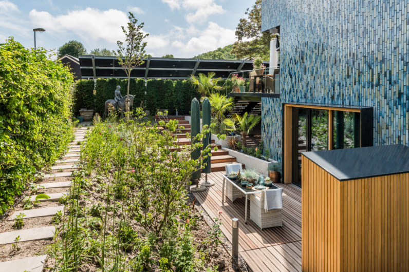 Het ontwerp is gemaakt in een komvorm. Daarmee is het van groot belang om de grond te stabiliseren en ‘vast’ te zetten middels een cortenstalen omranding en gebruikmakend van een systeemopbouw voor grond en beplanting met Fixodrive FX 50.