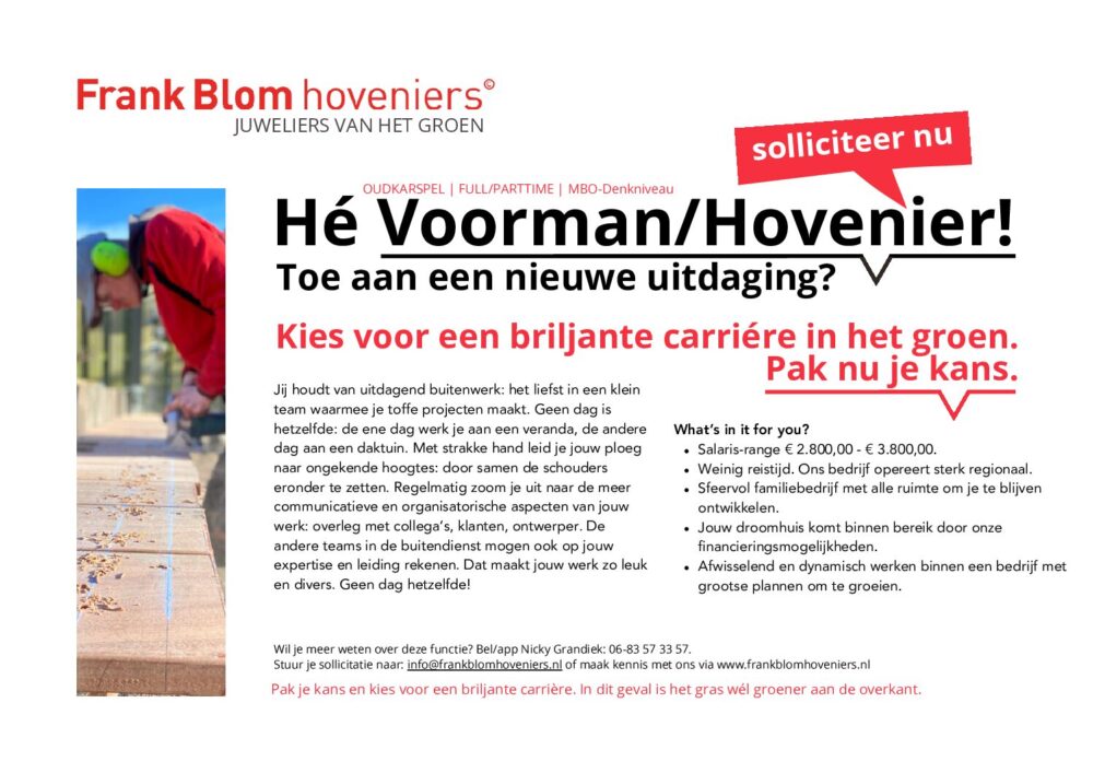 Ook tijdens ons verblijf in het buitenland hebben zij de 2 jaarlijkse snoeibeurt van de tuin op zich genomen. Alle contact verliep erg makkelijk via de email. Frank Blom en zijn team raden wij zeker aan, zowel voor de aanleg als voor onderhoud van de tuin.